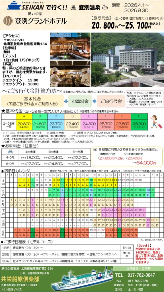 <旅行商品>フェリー&ホテルパック『登別グランドホテル』!