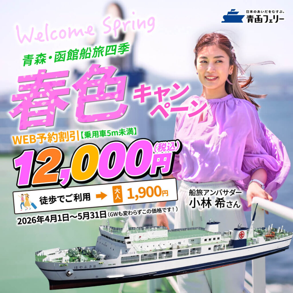 さて、厳しい雪と寒さが続きますが、青函フェリーではこの春(4/1~5/31)、WEB予約限定で格安の「春色キャンペーン」(特別割引)を実施し、皆様に軽やかに東北!北海道!をマイカー&船旅いただければと考えております。5m未満の乗用車が12,000円でGW(ゴールデンウィーク)も変わらずこの価格となりますので、ぜひぜひ、4~5月は青函フェリーの春色の船旅をご利用ください🌸